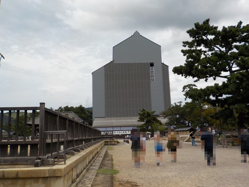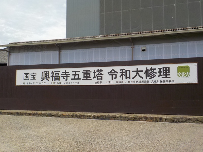 南円堂から東に歩くと、興福寺の五重塔があります。しかし、2034年まで令和大修理ということで、その姿を目にすることはできません。残念ですが、修理が終わるのを待つしかありません。